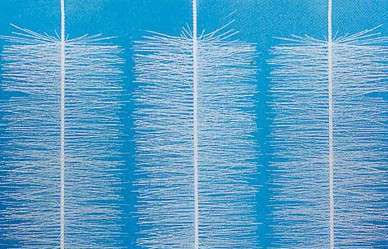 彈性立體填料篩選了聚烯烴類(lèi)和聚酰胺中的幾種耐腐、耐溫、耐老化的優(yōu)質(zhì)品種,混合以親水、吸附、抗熱氧等助劑,采用特殊的拉絲,絲條制毛工藝,將絲條穿插固著在耐腐、高強(qiáng)度的中心繩上,由于選材和工藝配方精良,剛?cè)徇m度,使絲條呈立體均勻排列輻射狀態(tài),制成了懸掛式立體彈性填料的單體,填料在有效區(qū)域內(nèi)能立體全方位均勻舒展?jié)M布,使氣、水、生物膜得到充分混滲接觸交換,生物膜不僅能均勻的著床在每一根絲條上,保持良好的活性和空隙可變性,而且能在運(yùn)行過(guò)程中獲得愈來(lái)愈大的比表面積,又能進(jìn)行良好的新陳代謝,這一特征與現(xiàn)象是國(guó)內(nèi)目前其他填料不可比擬的。